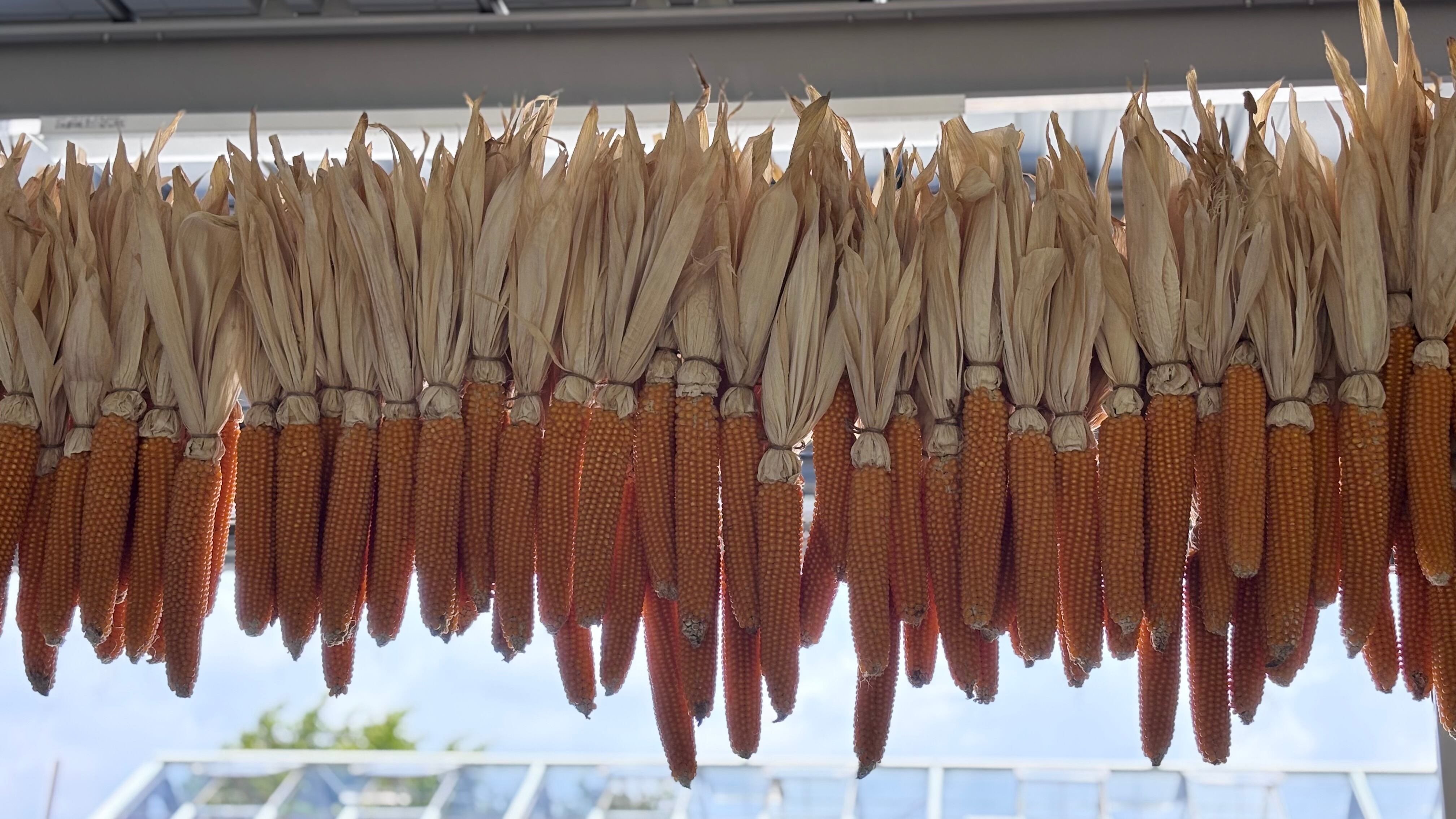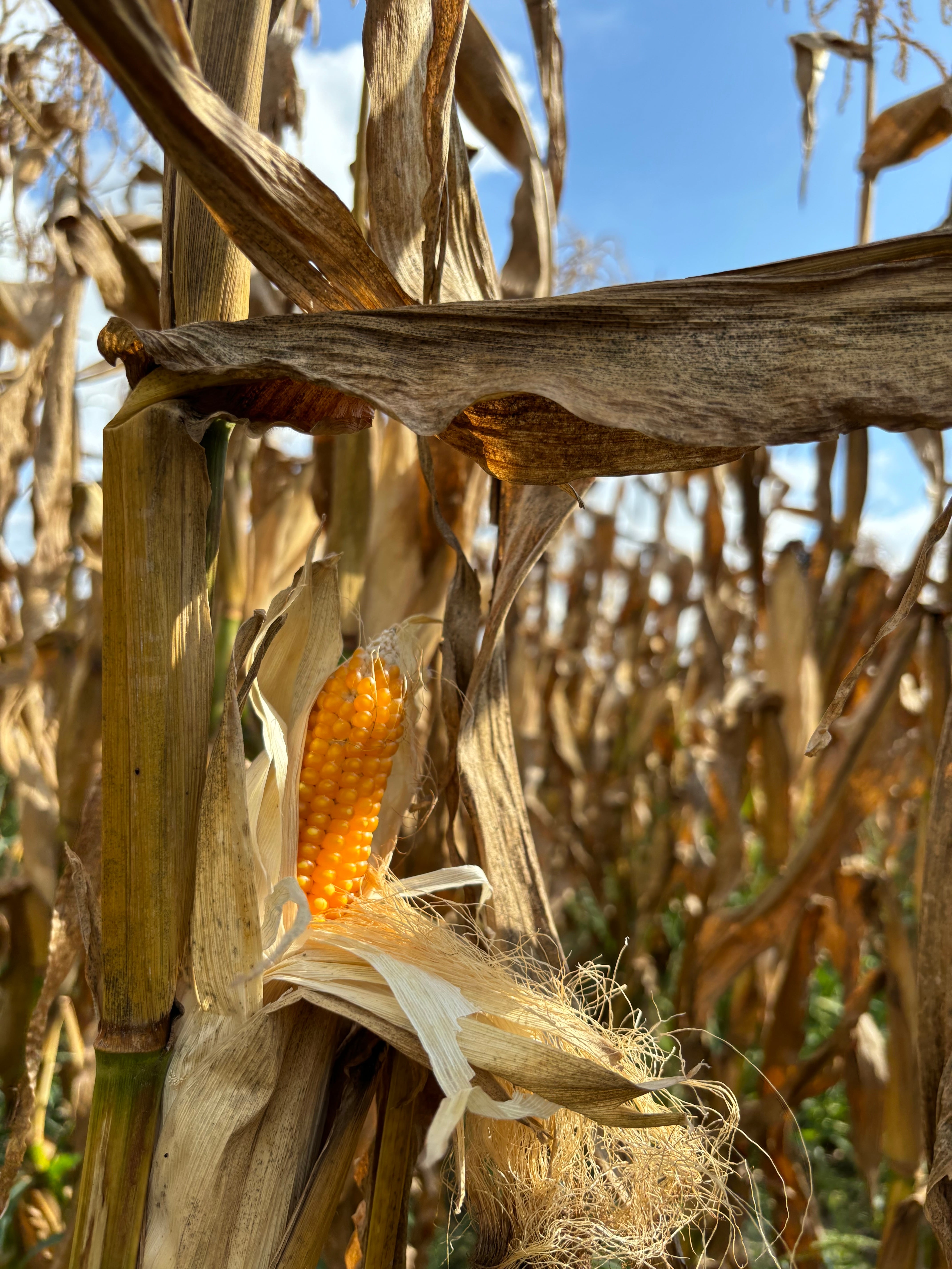 7月下旬→しっかり立ち枯れさせてたセミドライ状態のポップコーン用とうもろこしを収穫